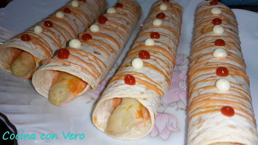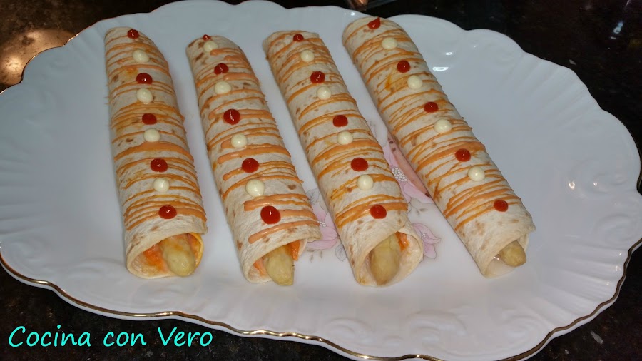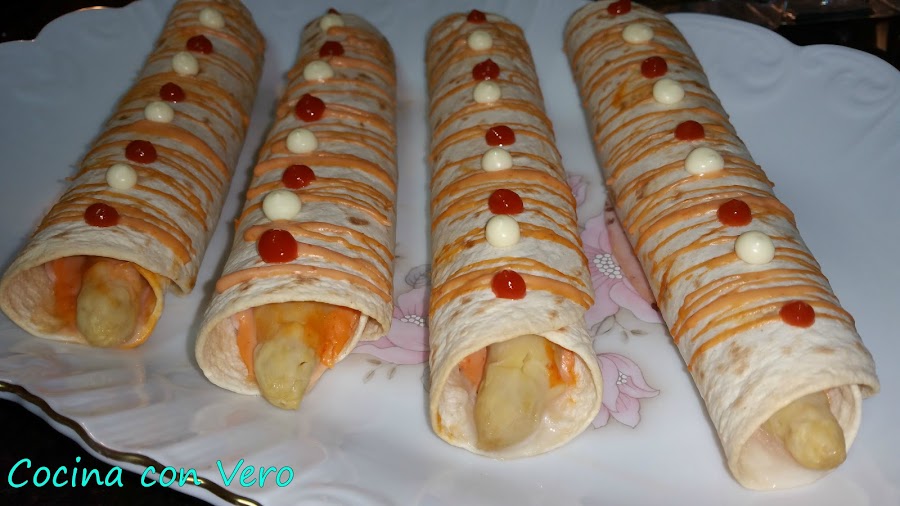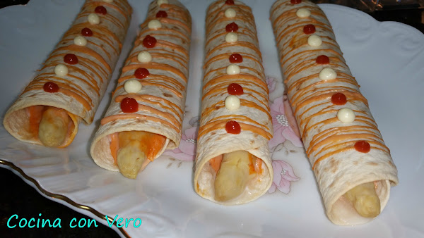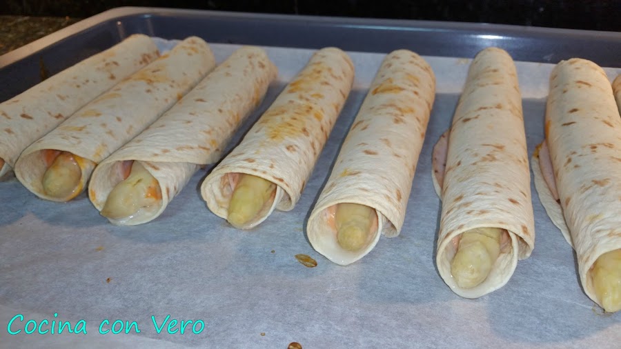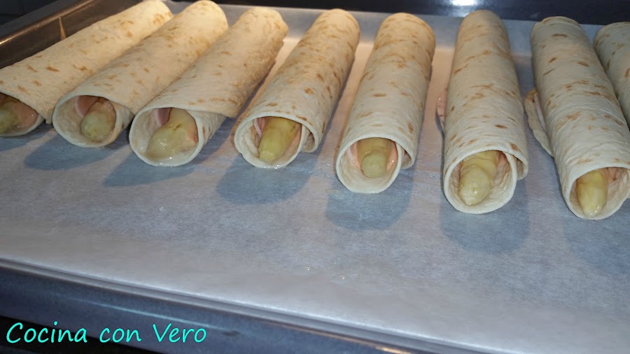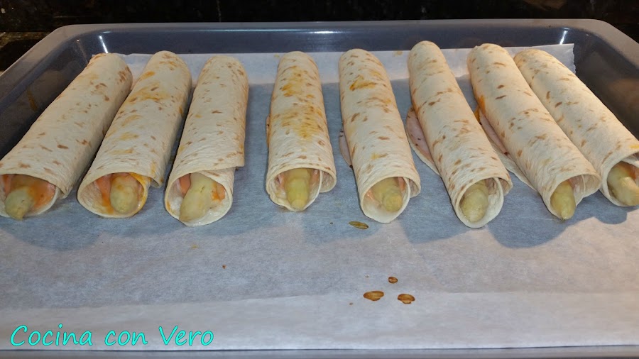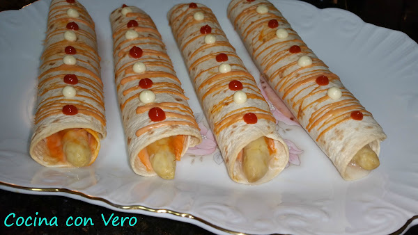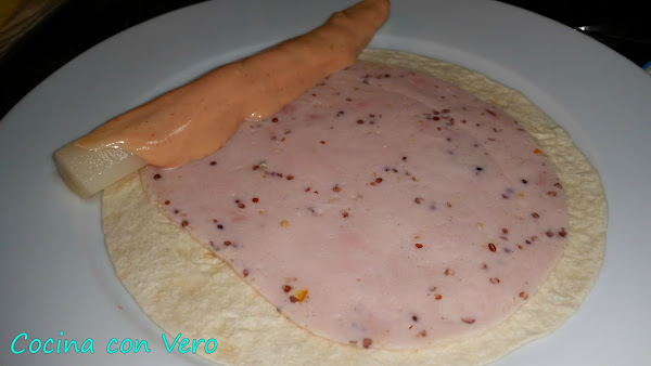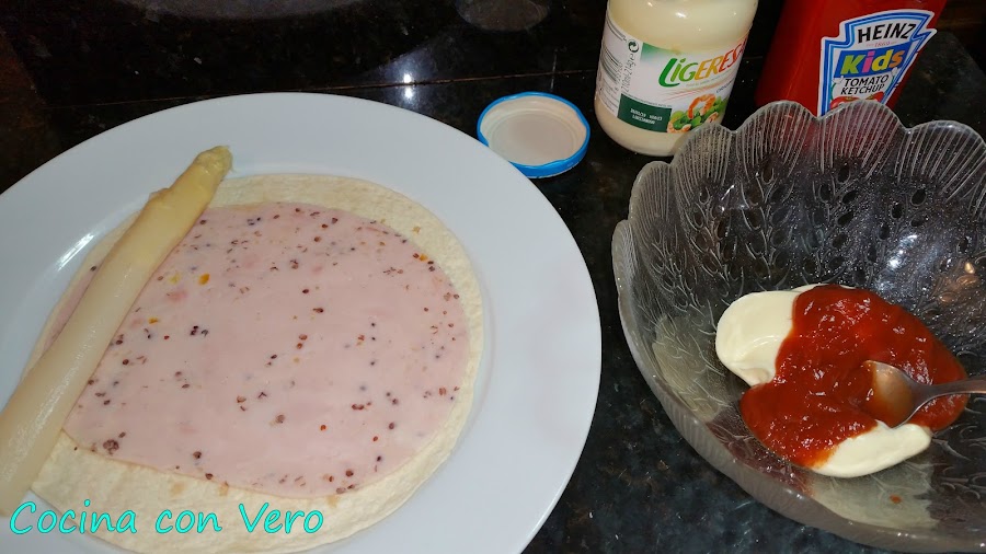 Cogemos un plato llano para proceder a hacer el enrollado, la base de tortilla, encima la loncha de pavo, el espárrago hacia uno de los laterales, la salsa rosa echa de mahonesa y ketchup en proporciones por igual mezclandolo en un cuenco (4 cucharaditas de mahonesa y 4 cucharaditas de ketchup). Vamos enrollándolo para hacer un rollito, hacemos lo mismo con el resto y los vamos dejando en la bandeja del horno previamente forrada con papel vegetal.