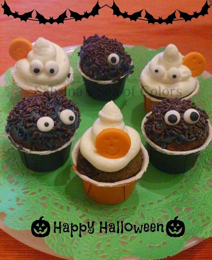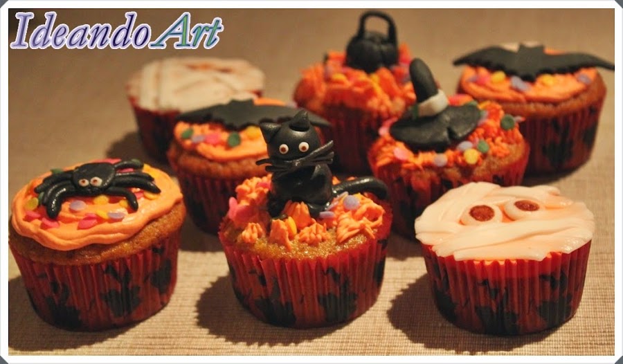 Y como los cupcakes son omnipresentes últimamente, también habrá que vestirlos de Halloween. Por ejemplo estos de IdeandoArt. ¡Qué manitas tienen!