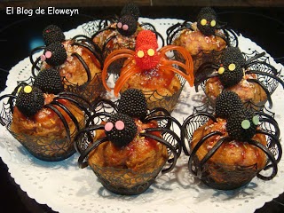 Y esto de las monedas se convirtió en una tradición. Se horneaban unos bizcochitos y se le metía dentro una moneda, a lo Roscón de Reyes. Ahora los bizcochos los rellenamos de mermelada de fresa y hacemos magdalenas sangrientas, como nos explican en el Blog de Eloweyn. ¡Me encantan las arañitas que le ha puesto!