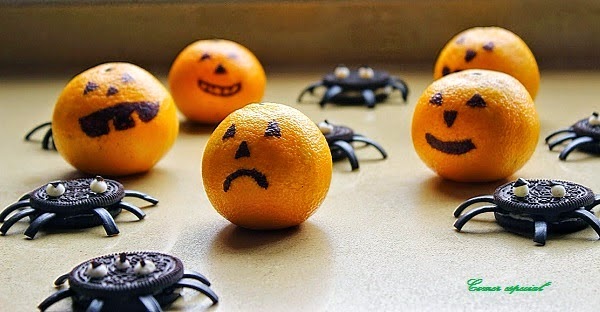 Oye y si ellos lo hacen, ¿por qué no nosotros? Que la calabaza es muy complicada de combinar (aunque ya os enseñé una receta estupenda), pues la cambiamos por una naranja. Por eso en Comer Especial, encontramos estas arañas de oreo con sus mandarinas de Halloween. Graciosísimas las arañas, ¿verdad?