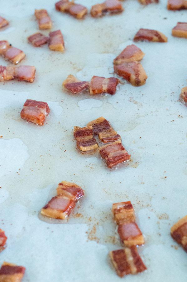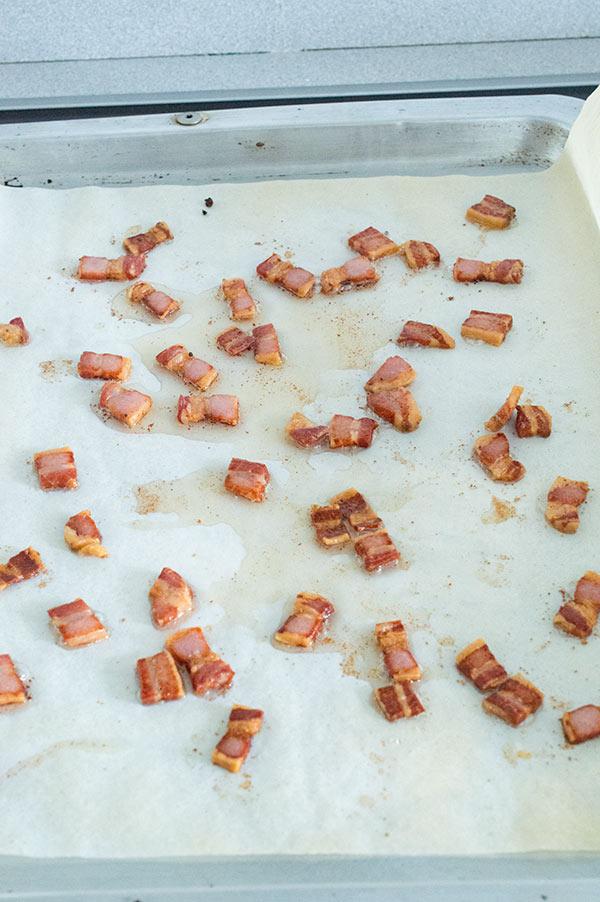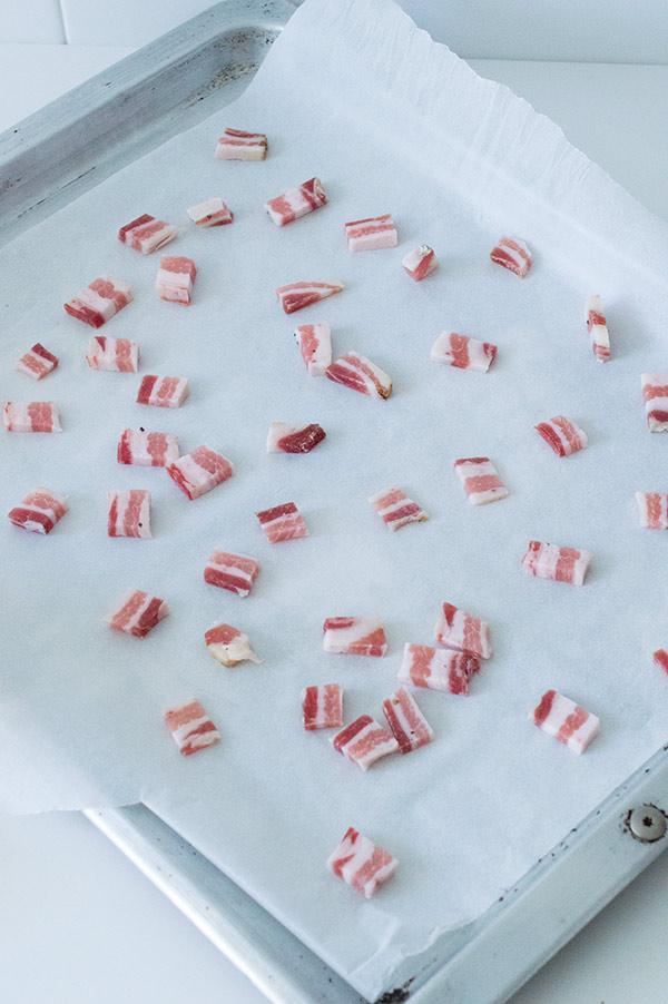 Troceamos la panceta y la colocamos en una bandeja de horno sobre un papel de horno y cocinamos durante 5 minutos hasta que este doradita.