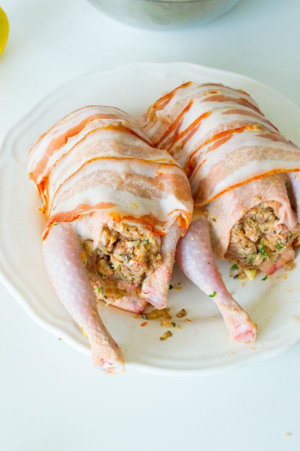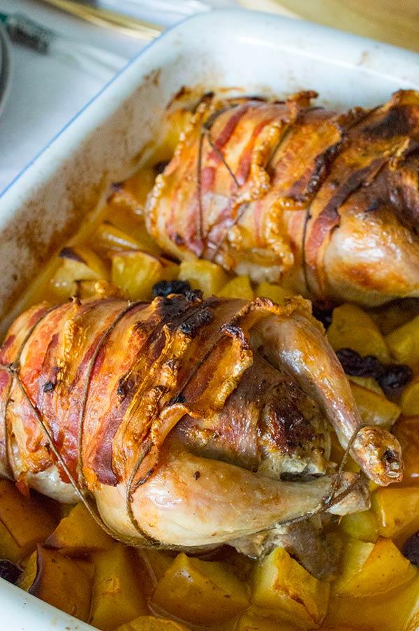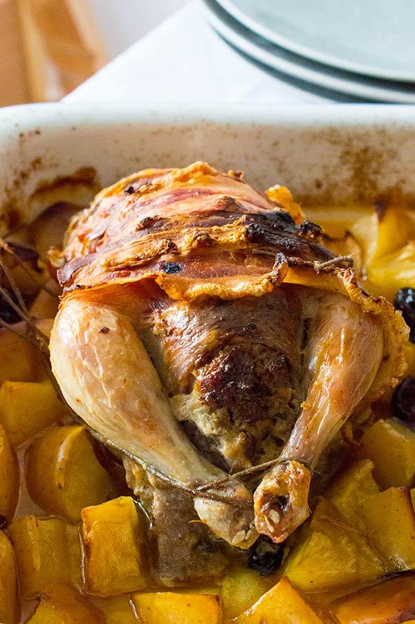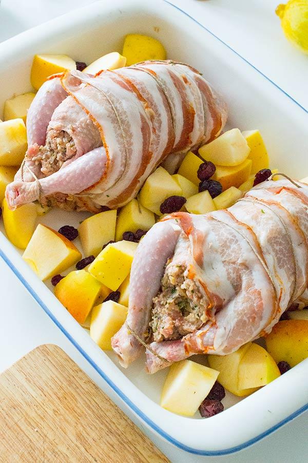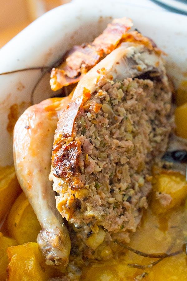 Lo primero es limpiar bien el ave, quitarle todas las posibles plumas que pueda tener, y masajearlo con mimo durante unos minutos, introduciendo un poco de mantequilla entre la piel y la carne, hacerlo con cuidado y por toda la pieza, no solo por la pechuga, los muslos también. Yo los he cocinado una hora mas o menos, si vais a usar un ave mas grande debéis de calcular media hora por kilo, tener en cuenta el relleno también deberéis de usar panceta mas gruesa, ya que va a estar mas horas dentro o lo podéis cubrir con un papel de aluminio para que no se queme