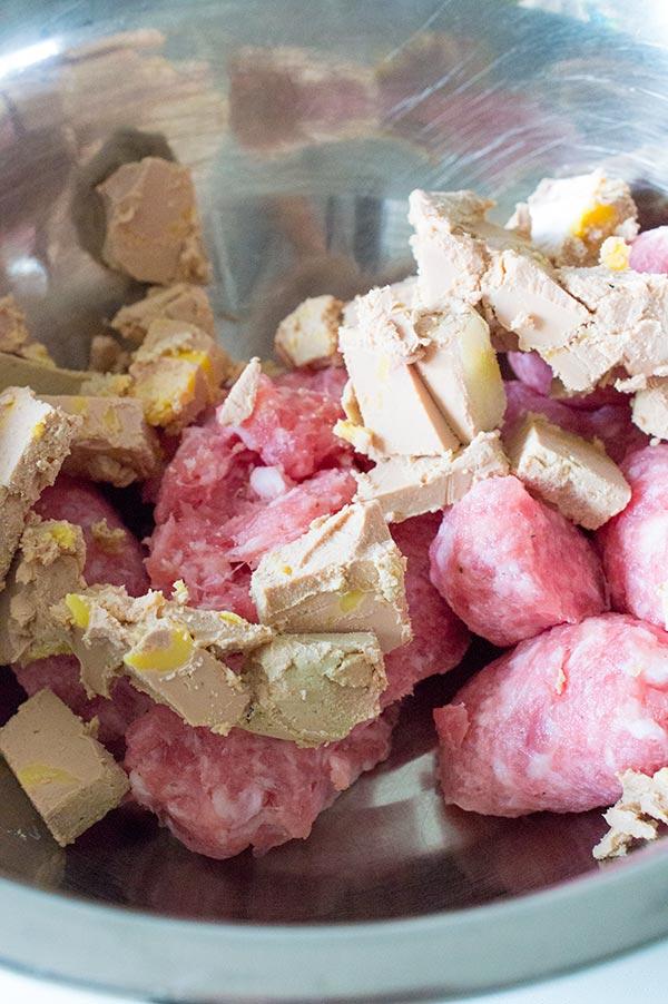 En un bol colocamos la butifarra sin piel y el fue que hemos cortado previamente.