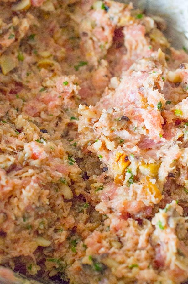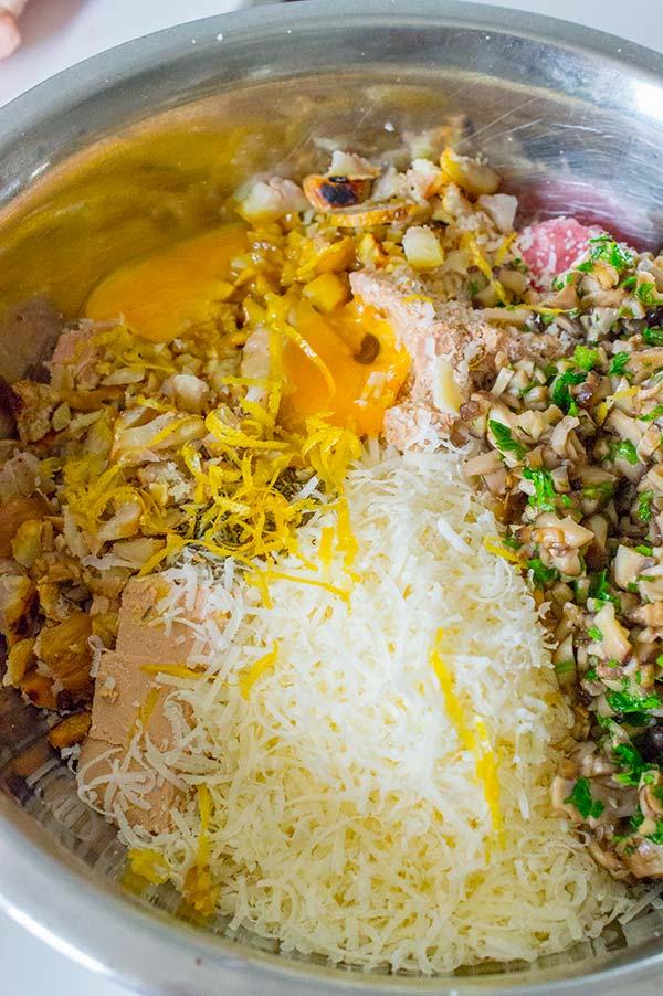 Picamos las castañas y las añadimos, junto con el resto de ingredientes, el queso rallado, las yemas de huevo, las setas removemos bien con las manos para que quede todo integrado, rectificamos de sal y pimienta.