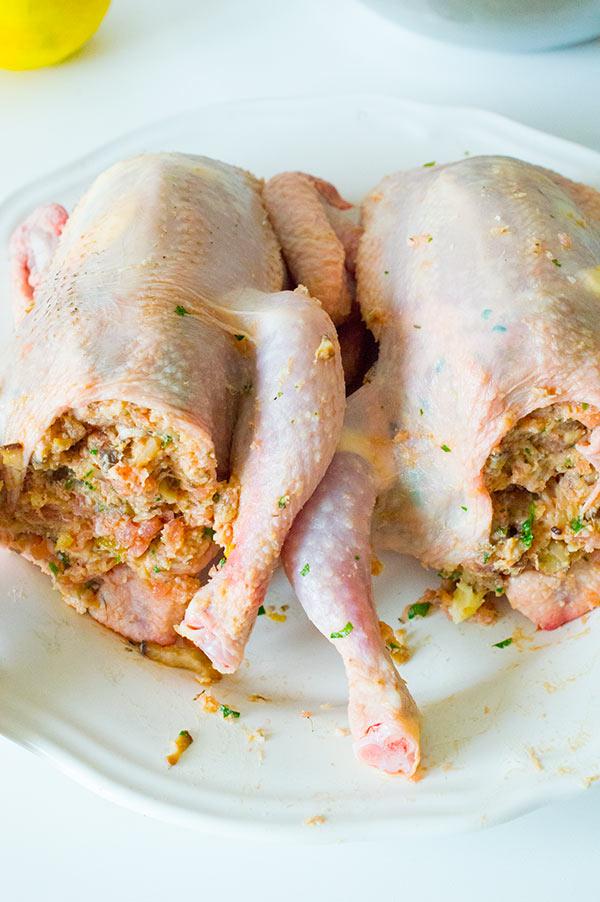 Los picantones rellenos son un plato mas que perfecto para estas fechas. La receta de hoy es la mejor receta que os voy a mostrar en este especial de navidad. He hecho picantones (pollos pequeñitos) pero vosotros podéis hacer el ave que mas os guste, una pularda, un pato, o un pavo quedaran también perfectos cocinados de esta manera Lo mejor de esta receta es el relleno, y el punto que se queda de la carne después de algunos trucos que os voy a explicar. Es cierto que al usar un ave mas pequeña, pues el tiempo de cocinado se reduce muchísimo aun recuerdo cuando mi padre empezaba a cocinar el pavo de la cena en casa de mi aduela a las 12 del mediodía, para comerlo a la noche era un pavo de 7 kilos o mas, jijijijijijij