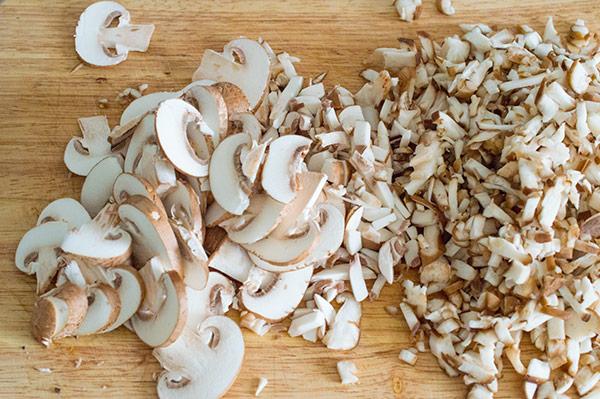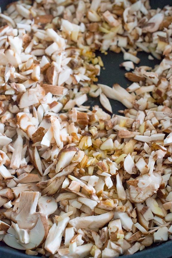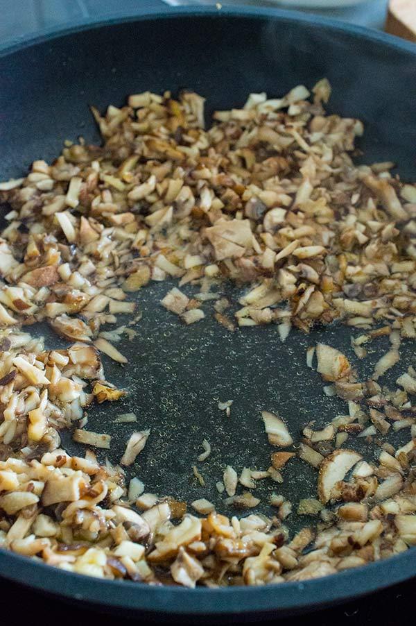 Picamos también las setas pequeñitas y las añadimos al sofrito, las cocinamos durante unos minutos.