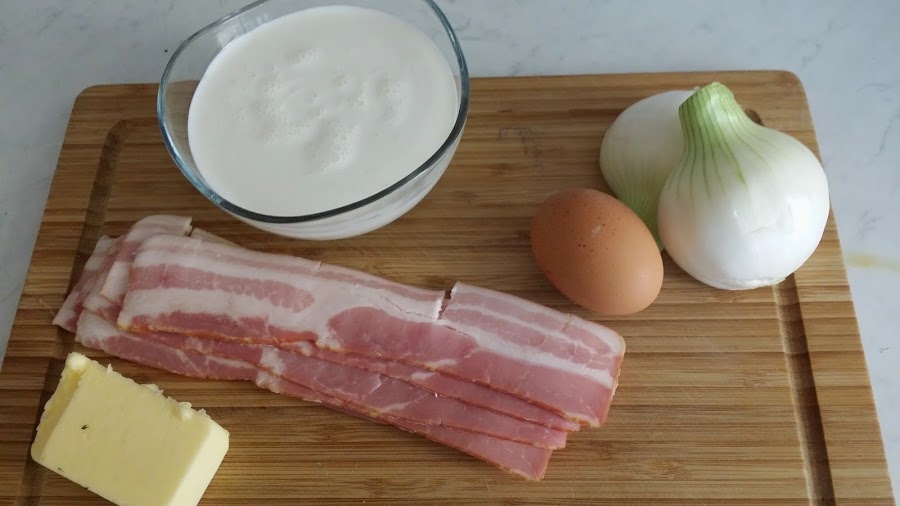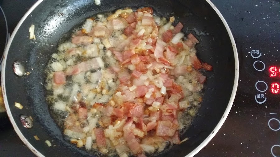 En una sarten fría ponemos un poco de aceite o mantequilla (dependerá de vuestro gusto, Oscar lo hace con aceite), la cebolla y el bacon, y rehogamos hasta que el bacon y la cebolla empiecen a dorar.