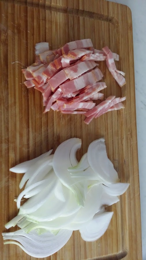 Cortamos la cebolla como mas nos guste, en juliana o en dadito dependerá de si nos gusta ver la cebolla o no. Cortamos el bacon de la misma forma.