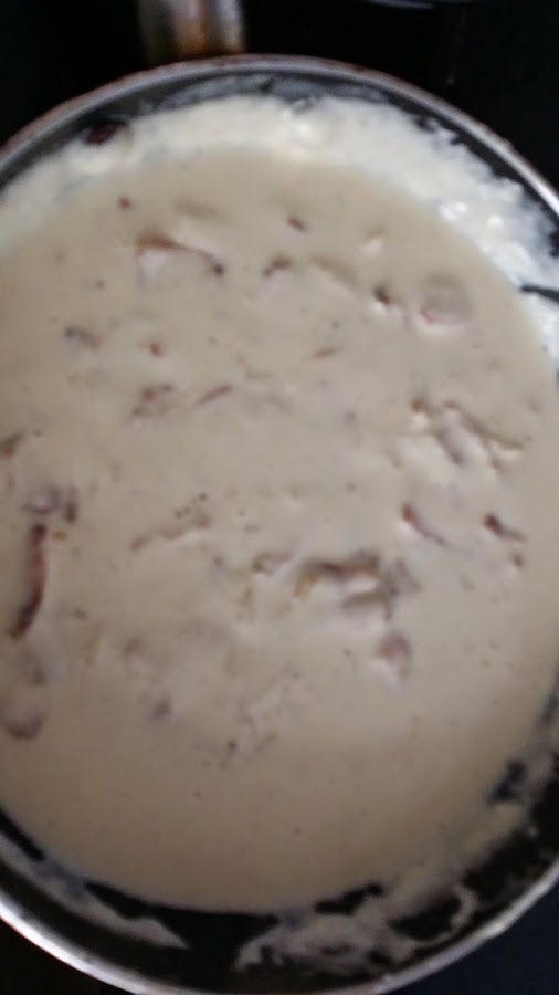 Cuando estén dorados añadimos la nata (crema de leche) y dejamos hervir durante 3 - 4 minutos (son minutos no segundos ni horas no da tiempo ni de ir al baño) y corregimos de sal y pimienta. La pimienta es un ingrediente mas en la receta no solo una especia (algún día nos explicara Oscar la diferencia entre ingrediente y especia).
