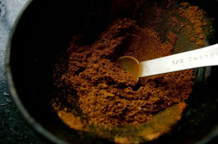 Grind all the spices seeds in a coffe grinder until you get a fine powder.