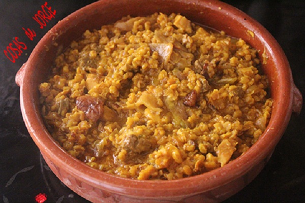 Escurrimos la espelta en un colador, la lavamos bajo el grifo, colocamos en la cazuela de barro que contiene las verduras, añadimos aproximadamente cuatro veces el volumen de los granos de espelta, la espelta, la pastilla de concentrado de verdura y dejamos cocer a fuego lento hasta que casi se evapore el agua, unos 20 minutos antes de que nos seque añadimos el pollo deshuesado y troceado.