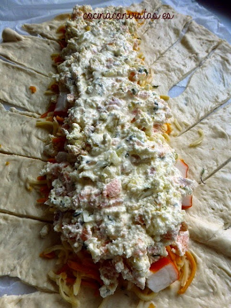 Sobre el centro de la masa, extendemos la mezcla de cuatro quesos rallados, encima colocamos las rodajas de los palitos de surimi y sobre estos la mezcla de salmón, queso y puerro.