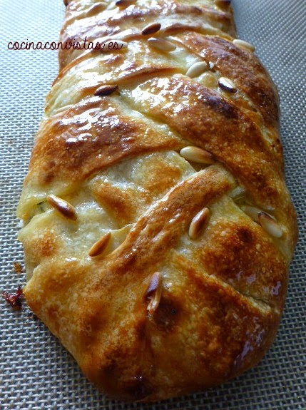 Cerramos la masa, dándole la forma de una trenza, untamos con el aceite de oliva virgen extra (aove) ecológico y espolvoreamos por encima los piñones.