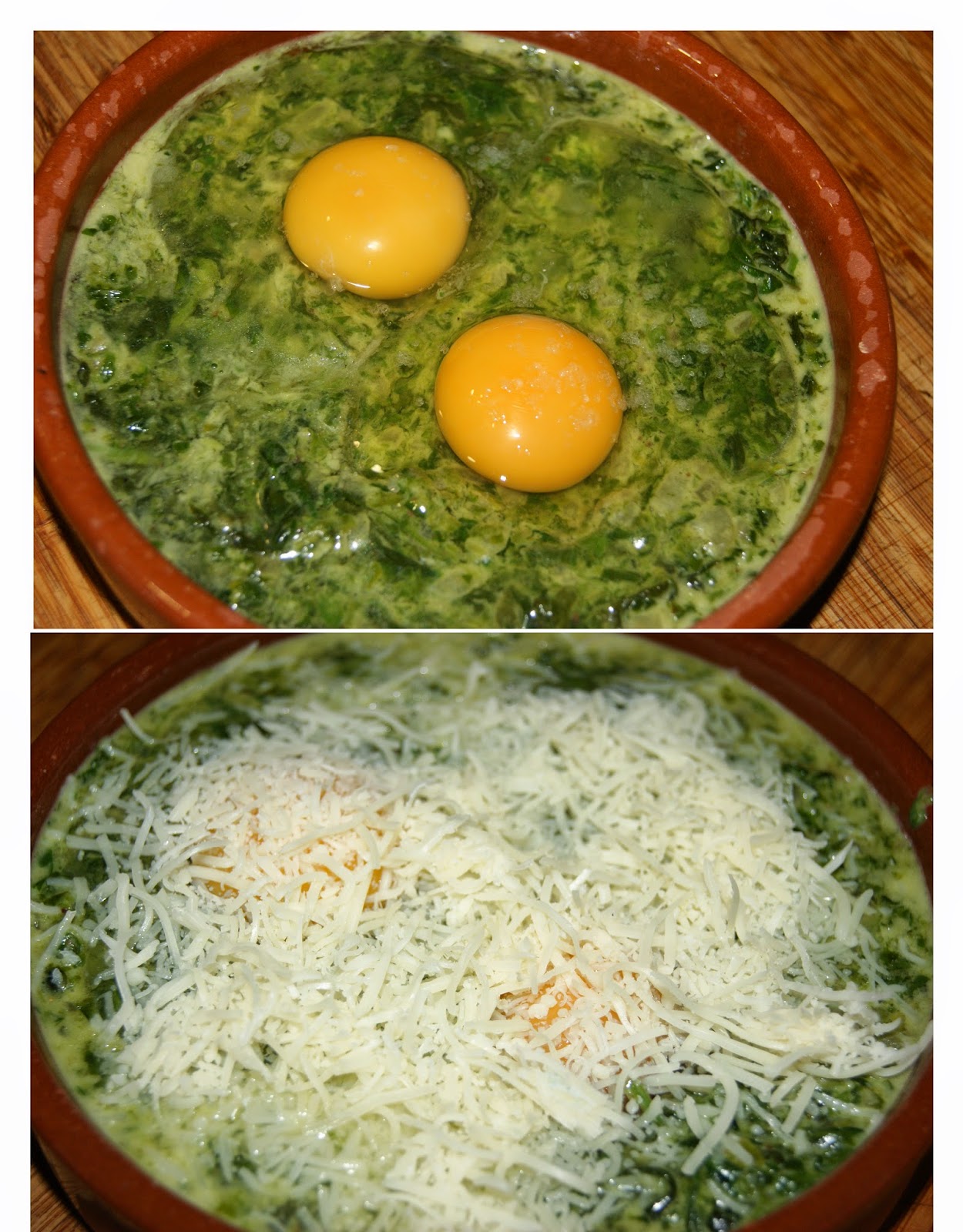 Repartir las espinacas en dos cazuelas, poner los dos huevos encima y espolvorear con el queso rallado.