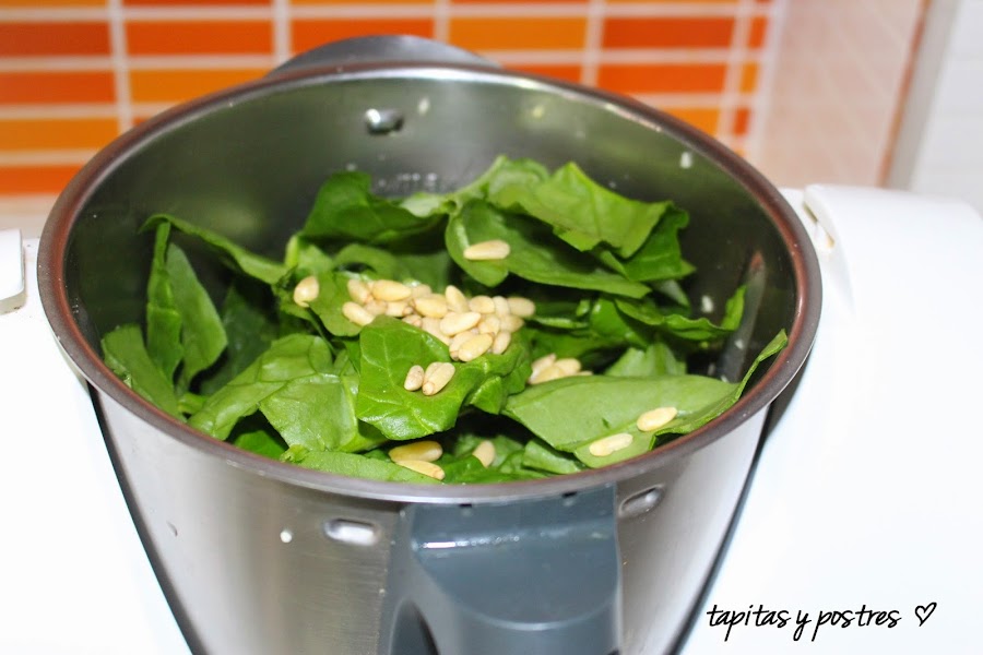 Pasado dos minutos, paramos la máquina y añadimos el resto de las espinacas (ya habrán menguado un poco) y los piñones. Dejamos que siga cocinando el tiempo que faltaba.