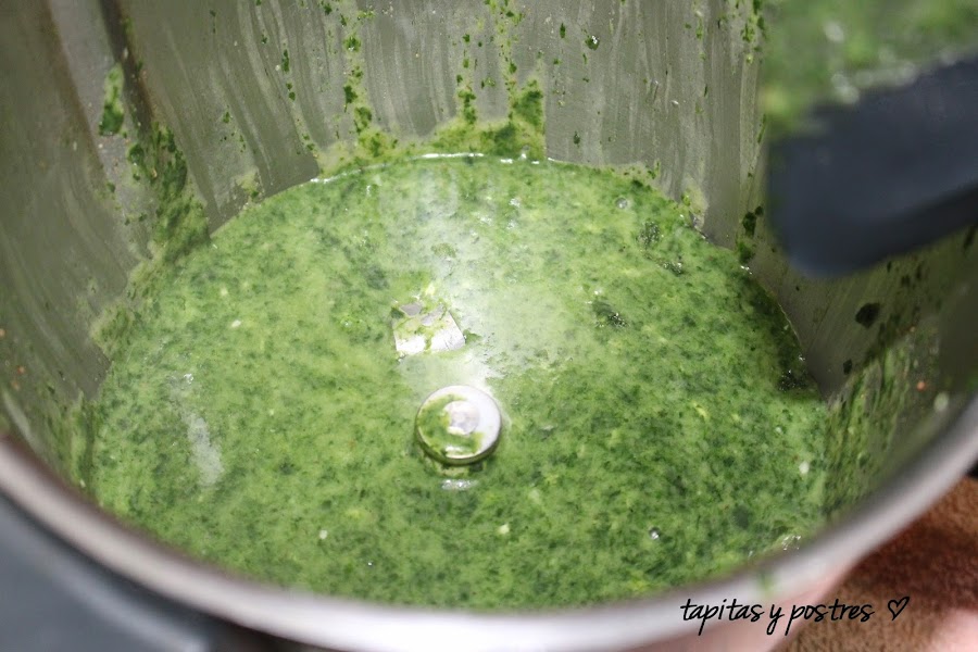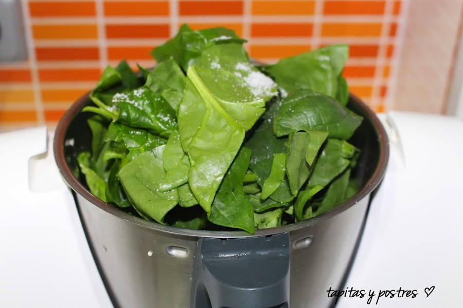 Incorporamos la mitad de las espinacas y programamos cinco minutos, varoma, velocidad cuchara. (en caso de usar espinacas congeladas, las ponemos todas a la vez y cocinamos el mismo tiempo y la misma velocidad pero con el giro a la izquierda).