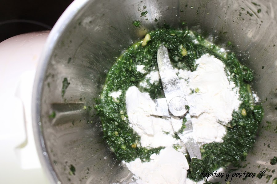 Una vez cocinadas las espinacas, las podemos triturar unos segundos, y ahora añadimos la harina y la rehogamos para que no sepa a crudo.