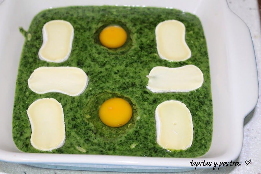 Precalentamos el horno a 200º y mientras en una fuente de horno, echamos la mitad de la crema. Cascamos dos huevos de codorniz y colocamos unas rodajas de queso de rulo. Para otra vez, pondré los huevos encima del todo, me gustan mas.