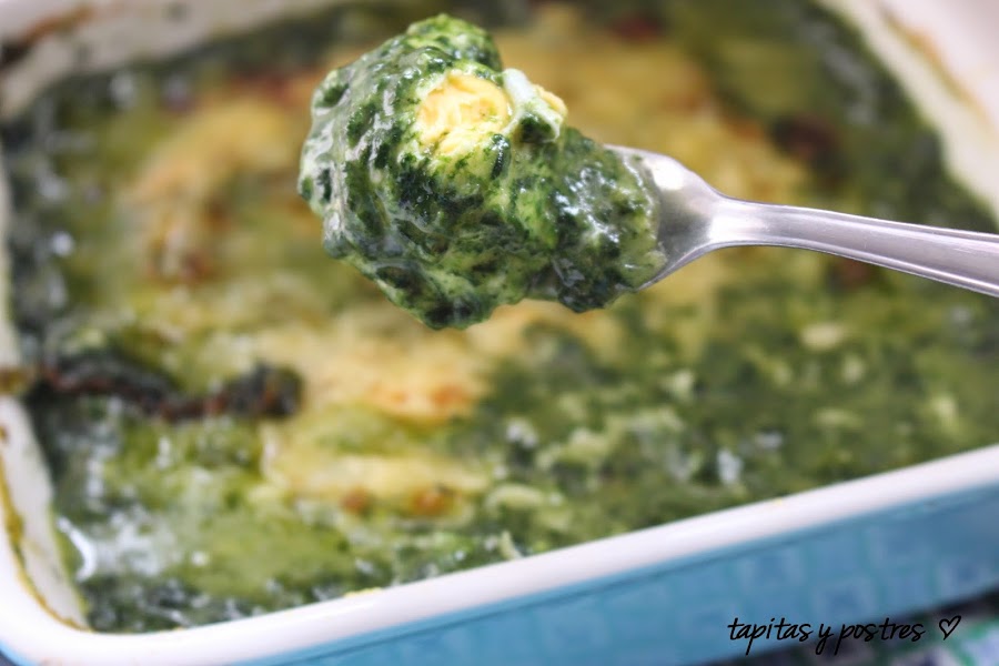 Esta receta de espinacas a la crema sale muy bien, es cómoda de preparar e incluso admite variaciones y tuneos interesantes, como yo he hecho, que he añadido piñones y queso a la crema. Otro día pondré unas gambitas...