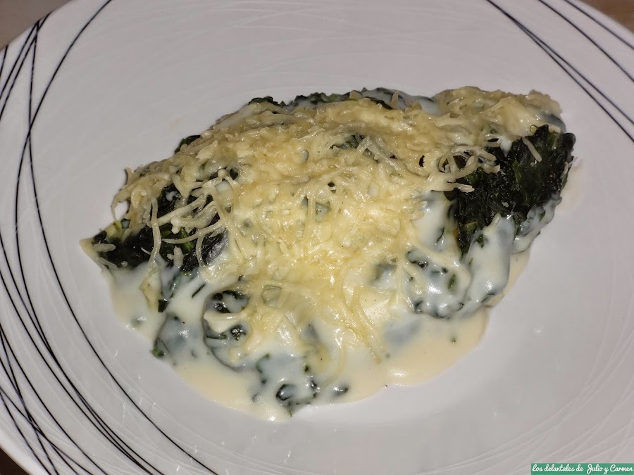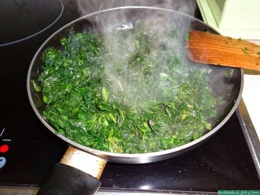 Realmente, este plato tiene poca historia, y es que fue la propia Carmen la que me propuso realizarlo. Tenia ganas de comer verdura, pero de una forma diferente a como la comemos a diario, y se le ocurrió que estas espinacas tenían que estar buenas, y acertó de pleno. Un plato suave, con un sabor muy delicado y que llena mucho. No fuimos capaces de comernos todo lo que preparamos, pero en realidad eso me vino bien, ya que así tuve comida para llevarme al día siguiente a la oficina..jeje.