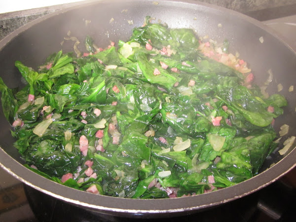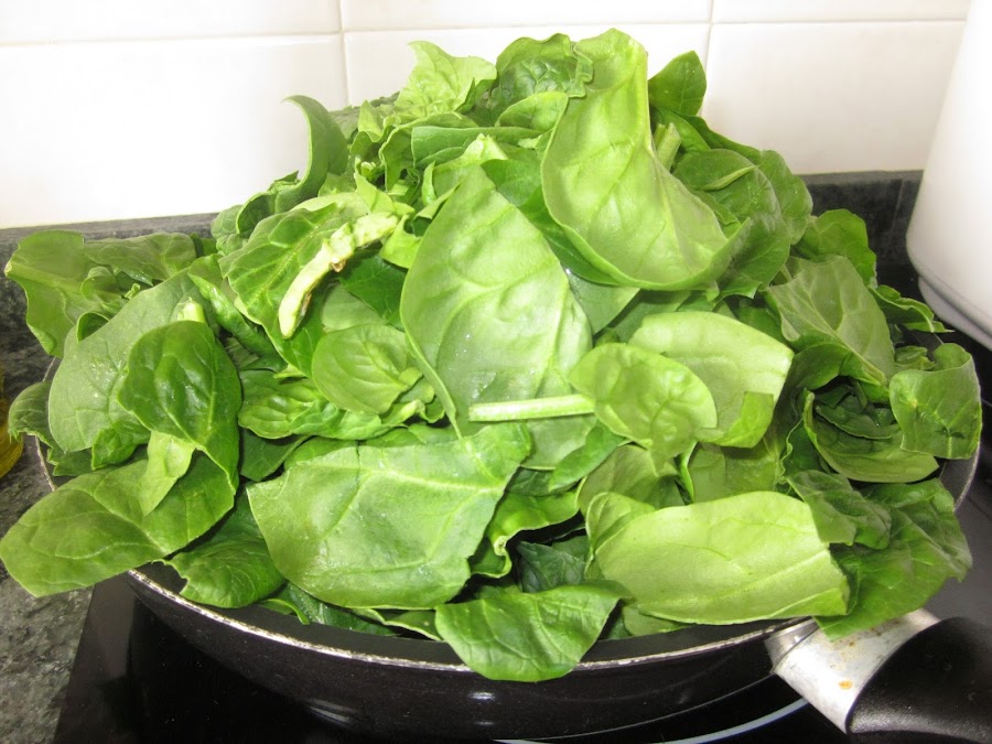 Rehogamos un poco y añadimos las espinacas, parecen muchas y no caben, pero al cabo de tres minutos se queda en nada..