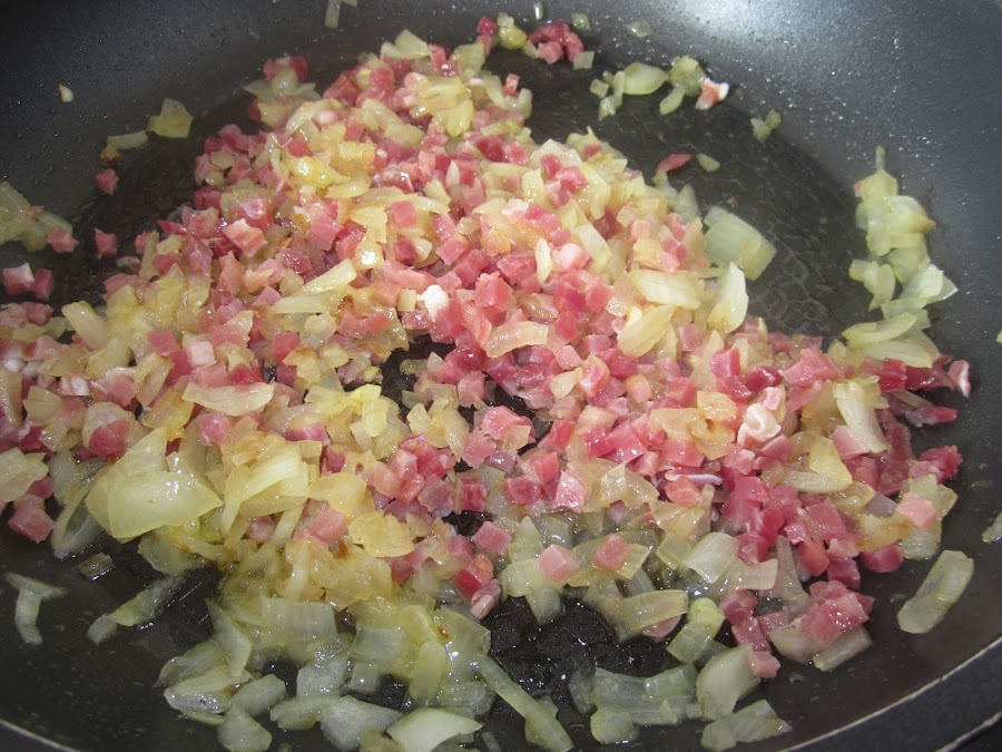 Ponemos a pochar en una sartén con un chorreón de aceite la cebolla cortada en brunoise.