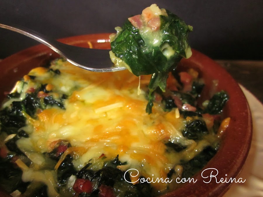 Ponemos en unas cazuelitas las espinacas, cubrimos de queso y gratinamos unos minutos a 200º.