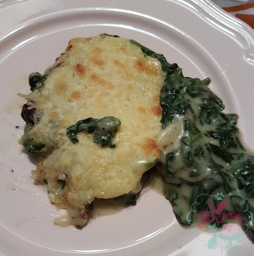 Poner en una sartén las dos cucharadas de aceite y saltear unos 5 minutos las espinacas, añadir un poco de sal, pimienta. Añadir la cucharada de harina y dar unas vueltas para que se cocine un poco, añadimos la nuez moscada y el brick de nata (crema de leche) de cocina. Movemos todo el conjunto y dejamos unos minutos en el fuego.