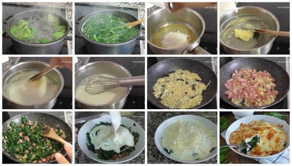 Ahora encendemos el horno en la función de gratinar a 180ºC y ponemos a punto la bechamel, con sal, pimienta y nuez moscada y emplatamos las espinacas.