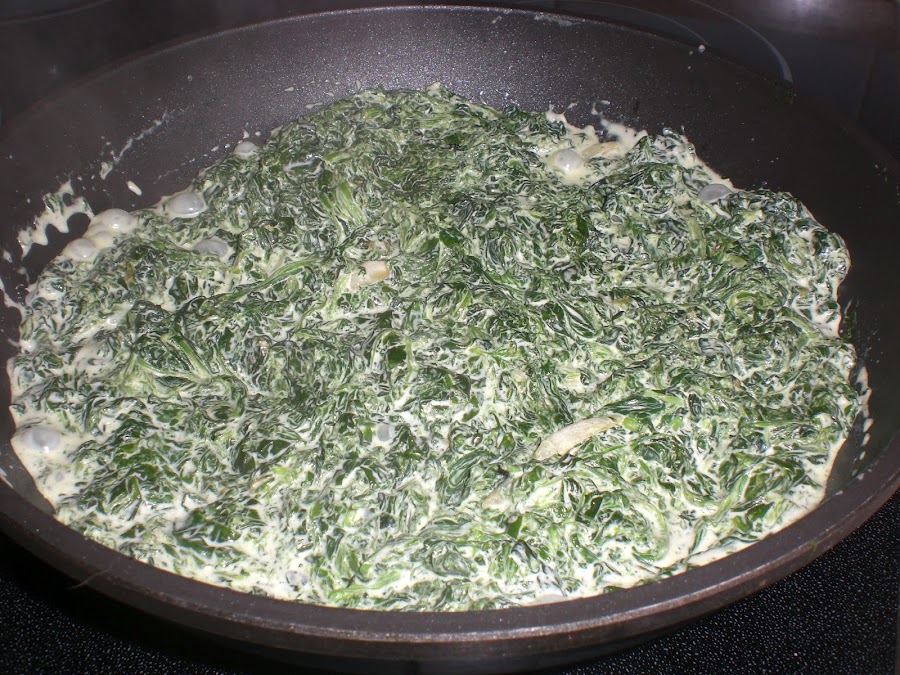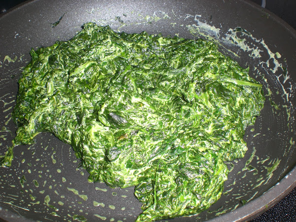 A continuación, agregaremos la nata (crema de leche) para cocinar y la mezclamos bien con las espinacas hasta que reduzca y quede todo una mezcla homogenea.