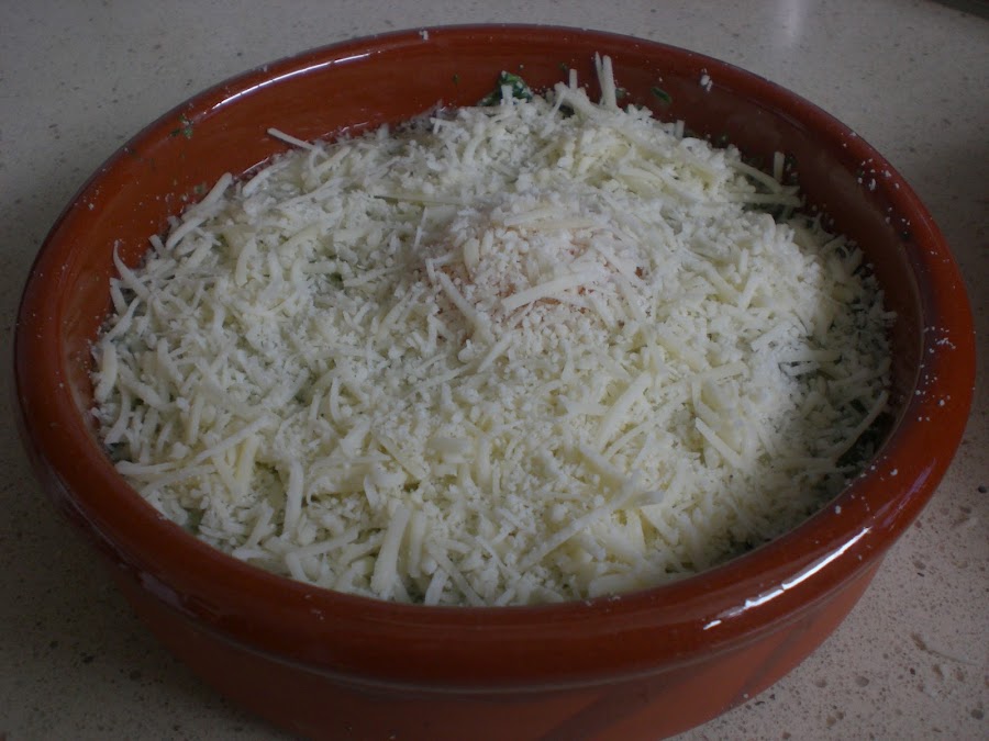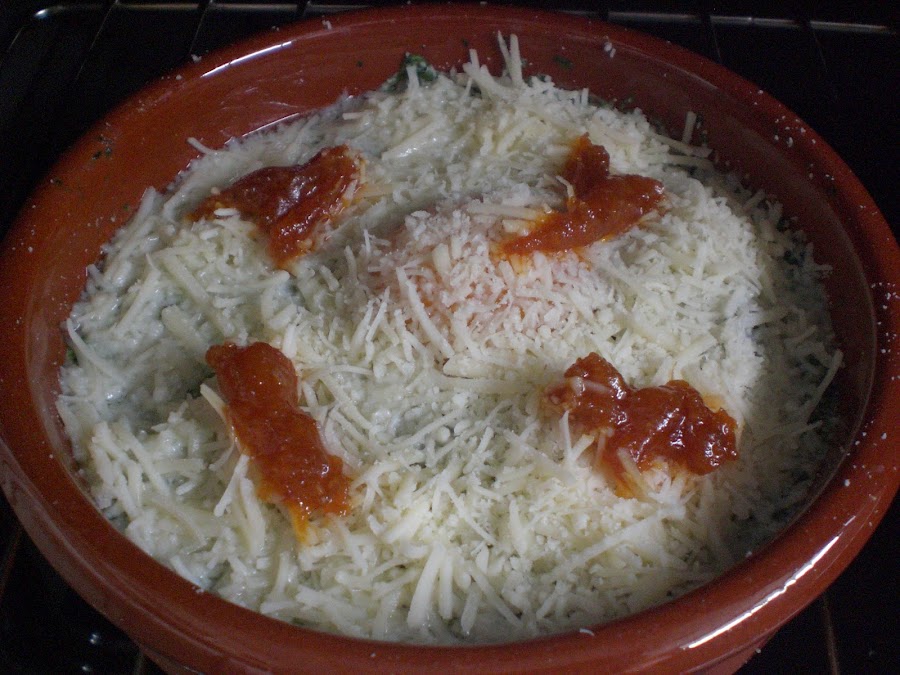 Colocamos sobre las espinacas un huevo por plato y, sobre éste, espolvoreamos el queso rallado.