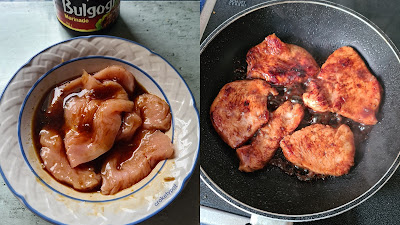 Lo hemos acompañado con unos filetes de pavo marinados el salsa bulgogi, () que es el marinado típico coreano para las carnes a la barbacoa, viene de de la combinación de las palabras “fuego” (bul) y “carne” (gogi) . que ahora te doy la mezcla por si no la encuentras en el mercado.