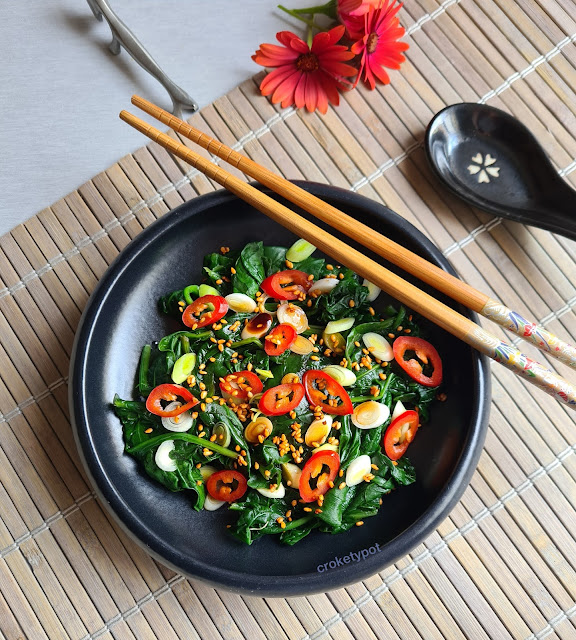 Con esta receta puedes empezar a tomar contacto con la cocina de Corea porque es muy fácil de preparar, el sigeumchi-namul , o espinacas aliñadas, es un entrante típico de esa cocina, allí lo llaman banchan , y se sirve con más platos de verduras fermentadas, kimchi y arroz. Lleva un toque picante, que se lo da el gochujang (pasta de ají rojo coreano) una vez que pruebes esta receta, ya no verás las espinacas de la misma forma el toque picante gusta mucho, y si eres adicto a los sabores fuertes, siempre puedes añadir un extra de guindilla.