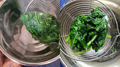 Poner a hervir el agua y añadir las espinacas escalar 2 minutos y retirar inmediatamente sobre agua con hielo, refrescar, colar y escurrir apretando con la mano.