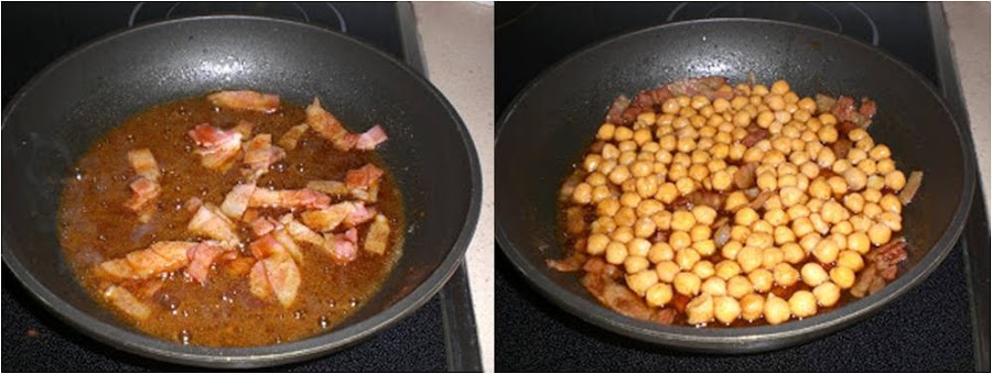 Seguidamente, incorporamos los garbanzos limpios y escurridos y que se mezclen bien con el juguito y con el beicon. Vereis que van cogiendo color rojizo.