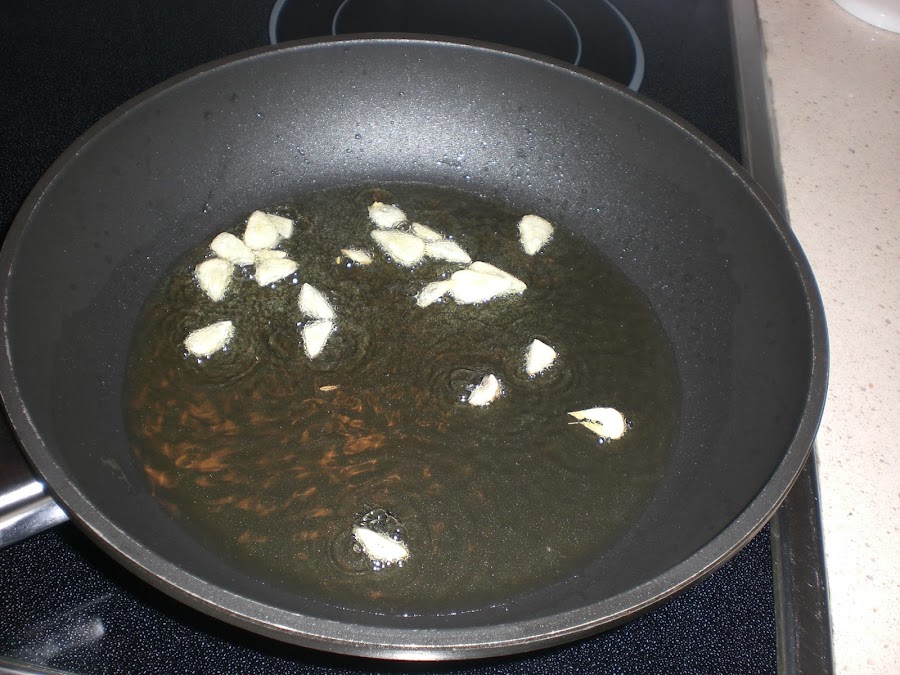En una sartén con un buen chorrito de aceite de oliva virgen extra, pondremos los ajos cortados a láminas a dorar a fuego medio-alto.