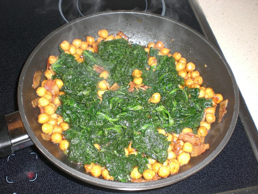 Pasados unos minutos, que ya hagan cogido colorcillo, ponemos las espinacas bien escurridas y las vamos mezclando con el resto de ingredientes.