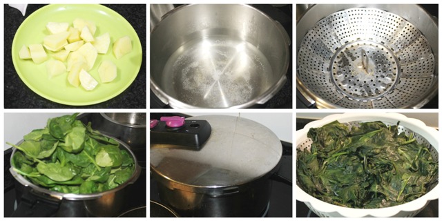 Preparamos la olla exprés (se puede hacer en olla convencional, alargando los tiempos de cocción, lo único que hay que comprobar es que la patata esté hecha), pondremos agua en la base (unos 4 dedos) y le echamos sal. Ponemos el accesorio para cocer al vapor (también se pueden cocer directamente en el agua por supuesto, pero así no perdemos tantos nutrientes). Incorporamos primero las patatas y después las espinacas (os parecerá una cantidad descomunal, ya veréis luego cuando abráis la olla en lo que se habrá convertido). Cerramos la olla, y cuando haya saltado la válvula lo dejaremos 5 minutos. Pasado ese tiempo lo apartamos del fuego y esperamos que la válvula baje antes de abrir la olla (este tiempo de espera es muy importante, si abrimos la olla antes de tiempo podemos correr serio peligro).
