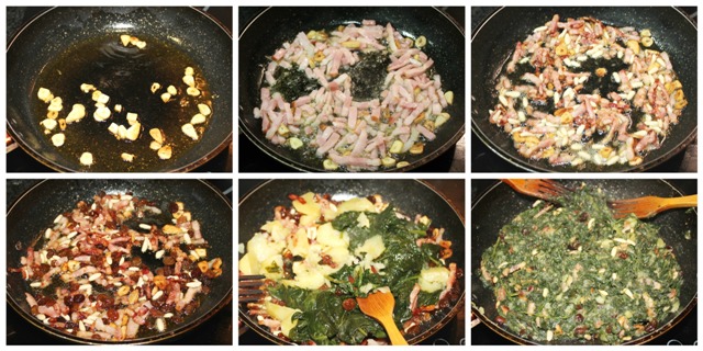 Una vez lo tenemos todo incorporaremos a la misma sartén las espinacas y las patatas, con ayuda de un tenedor iremos mezclando y chafando las patatas y la acelga. Lo tendremos un par de minutos al fuego y retiramos.