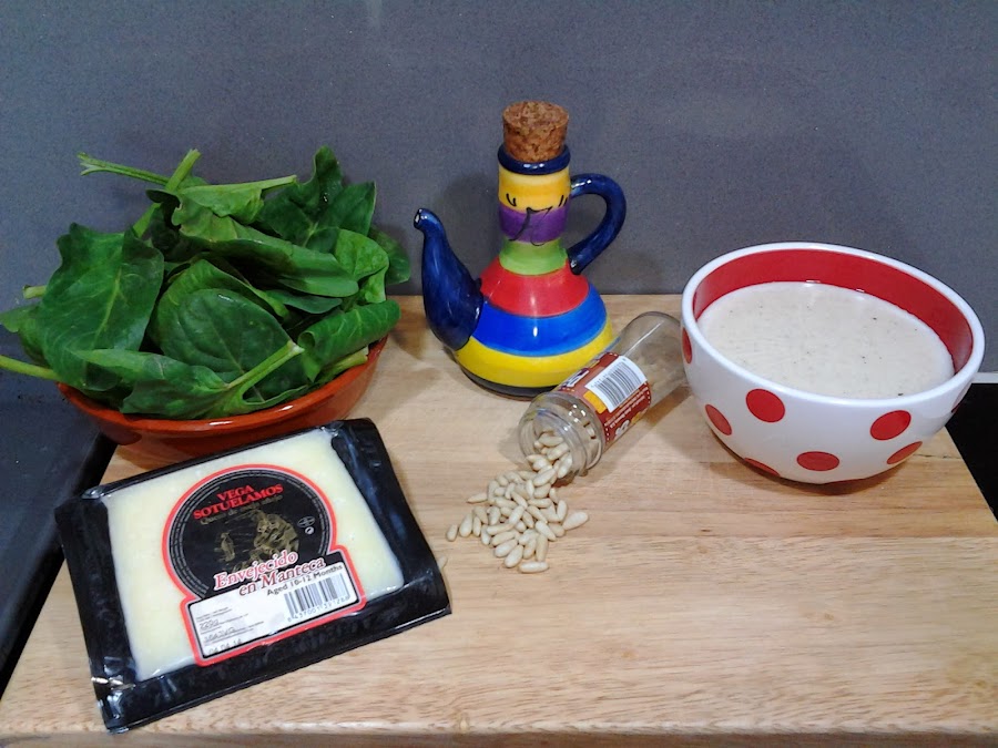 Lo primero que debemos hacer es tener lista la bechamel. Para ello os explico aquí como prepararla. Una vez lista, ponemos un chorrito de aceite en una sartén y rehogamos las espinacas.