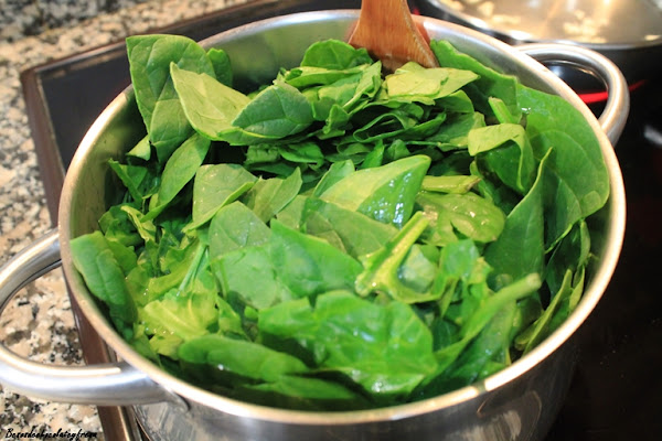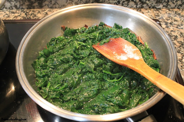 The first will bring water to a boil in a large saucepan and cook the spinach with a dash of olive oil. While we finish cooking in a frying pan fry the chopped garlic and then add the spinach and sauté all together.