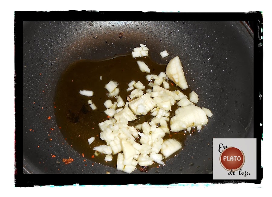 En la misma sartén, doramos los tres dientes de ajo muy picados y le echamos una cucharada de pimentón dulce. Removemos rápidamente y retiramos del fuego ya que si el pimentón se quema da mal sabor.