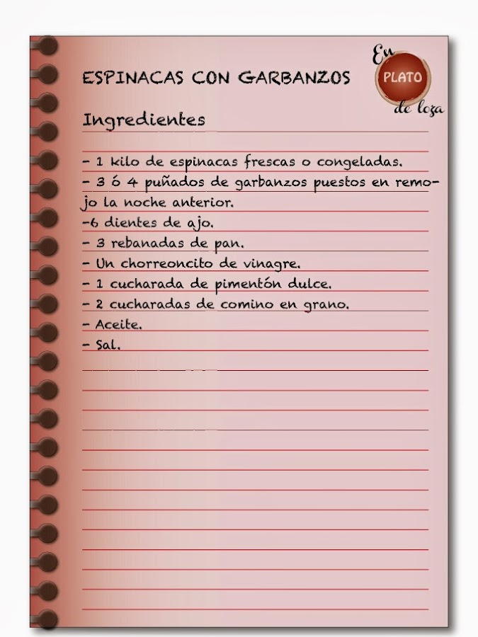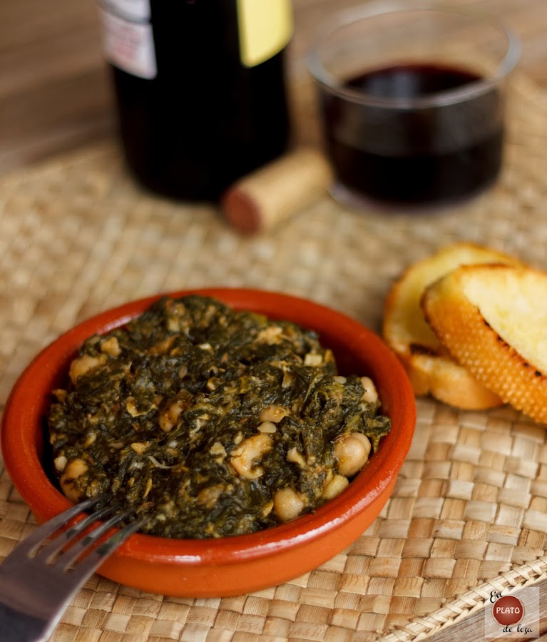 Hoy tocaba en casa otro de esos platos de toda la vida, de los que has visto en casa de tus padres y se han transmitido durante generaciones. Un plato típico andaluz de cuchareo pero también una tapa estrella de muchos bares típicos, de Sevilla sobre todo. Al menos que yo conozca... ¿En vuestras ciudades también las ponen en los bares? En Huelva no las he visto tanto, sin embargo en Sevilla es muy típico la platea de barro con las espinacas con garbanzos. De hecho, si estás de por el centro, aprovecha y visita El Rinconcillo, en la plaza de los Terceros, una bar-taberna centenario con mucho encanto, donde las ponen exquisitas. Y ya que estás, si hace calor que no es difícil, das la vuelta al edificio y pides una cerveza en El Tremendo, fresquita, fresquita, es uno de los lugares donde mejor la tiran.