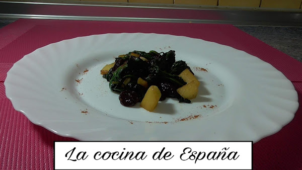 A continuación echamos los piñones se rehoga un poco, a continuación echamos las pasas que 24 horas antes las echamos ron para que se hidraten y tengan sabor, las echamos con el ron que sobre también se rehoga.