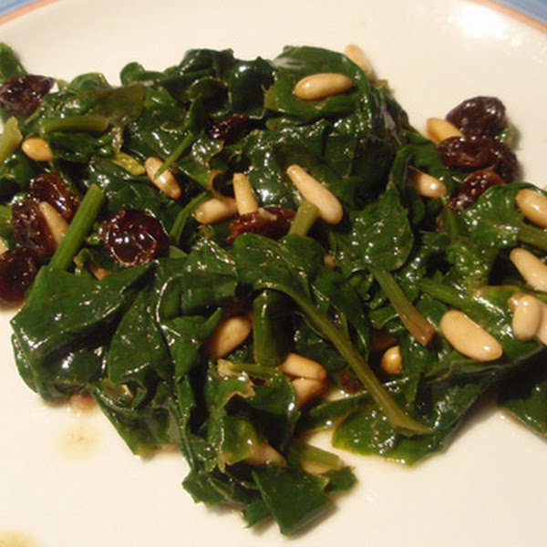 250g de espinacas ? 2 cucharadas rasas de pasas sin semillas ? 2 cucharadas rasas de piñones ? tres cuch aradas de aceite de oliva ? sal