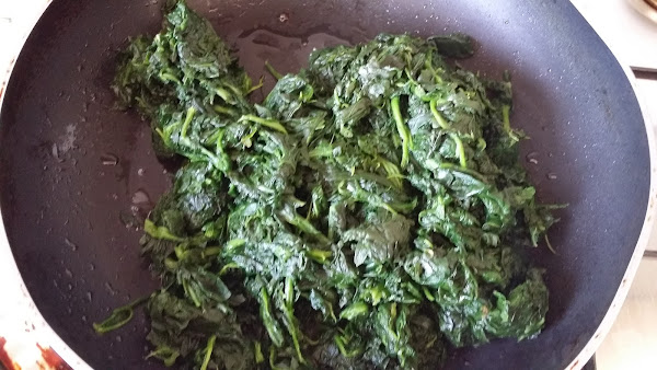 Ponemos las espinacas en un recipiente apto para microondas y cocinamos a media potencia unos 8 min removiendo de vez en cuando.