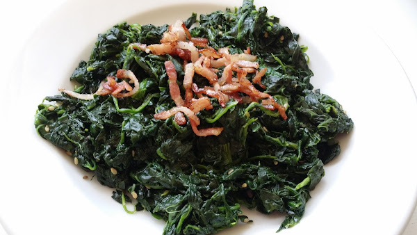 Y ya solo nos queda emplatar las espinacas y ponerle por encima las tiras de bacon tostadas.
