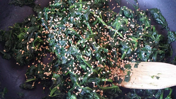 Pasados un par de minutos le añadimos 2 cucharadas de postre de sésamo y una de café de jengibre, removemos muy bien y lo dejamos 1 minuto al fuego.