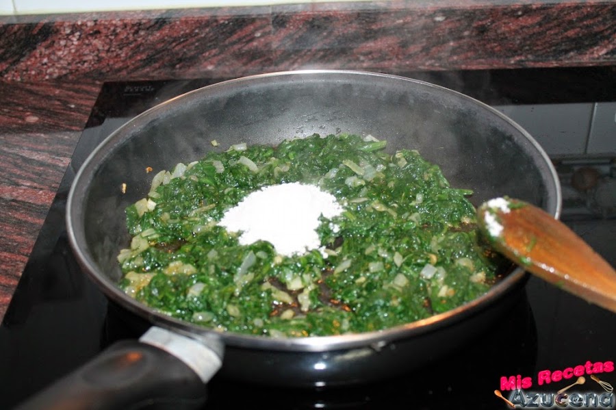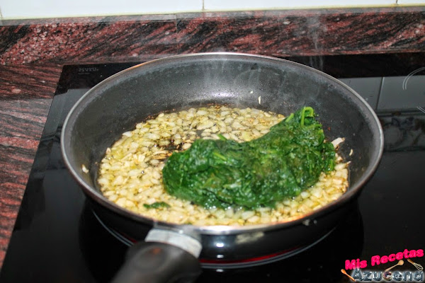 Pasado 1 minuto después de añadir el ajo, añadiremos las espinacas, removemos todo y dejamos sofreír durante 2 minutos más.