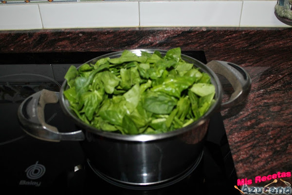 Pondremos una olla agua a calentar al fuego, a fuego medio alto, cuando este caliente le añadiremos las hojas de espinacas y las dejaremos cocer entre 12 y 13 minutos, una vez pasado ese tiempo retiraremos del fuego y escurriremos las espinacas reservando el caldo de la cocción.